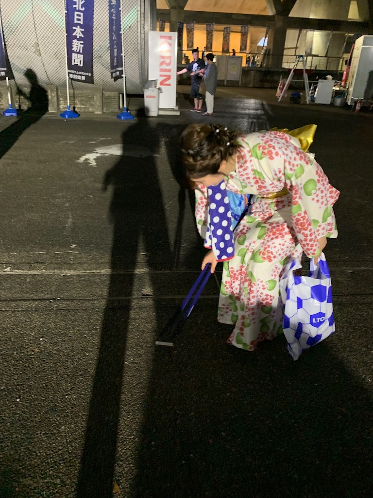 8月のナイトゲーム恒例の「県総DE打ち上げ花火」がハーフタイムに色鮮やかに打ち上げられました。その花火の後押しもあり、チームは見事逆転勝利!! 勝利の余韻に浸りたい思いをグッとこらえて、今回もごみ拾いにご協力いただきまして誠にありがとうございました。