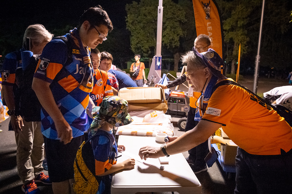 今回は19:00 kick offの為、試合終了後のスタジアム周辺は暗くなってしまいましたが、 多くの皆様に参加いただきました。