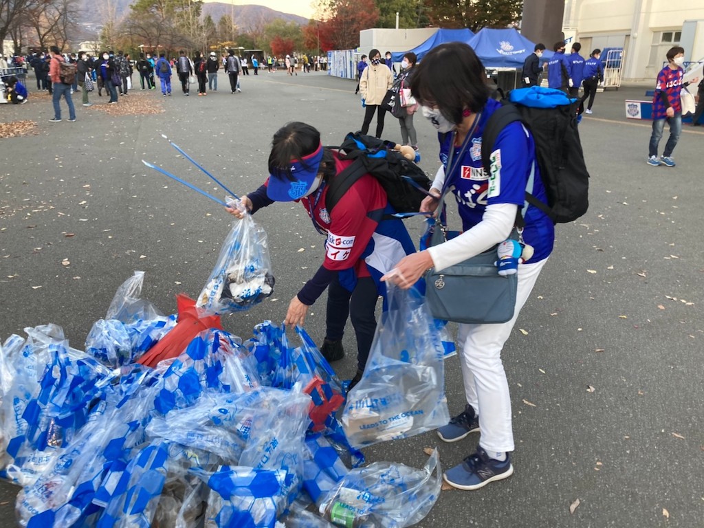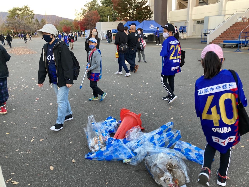 今節は「+1キャンペーン」の実施がありました!ゴミ拾いマスターに向けて最後の追い込みです!皆さん悔しい気持ちが強かったと思いますが、それでも海にゴミを行かせないように、ゴミ拾いにご協力いただき本当にありがとうございます。ゴミの中にボロボロになったカラーコーンがありましたが、誰かがドリブル練習でも行っているのでしょうか。それにしても使い込んでいるので、相当練習されてますね、、、使い込んで要らなくなったとしても、公園にポイ捨てをいけません。一生懸命ゴミ拾い(海を守る)する甲府サポーターをみて少しでも何かを感じてほしいところです。たくさんの方に参加をしていただき、もっとこの活動を広めていかないといけませんね。