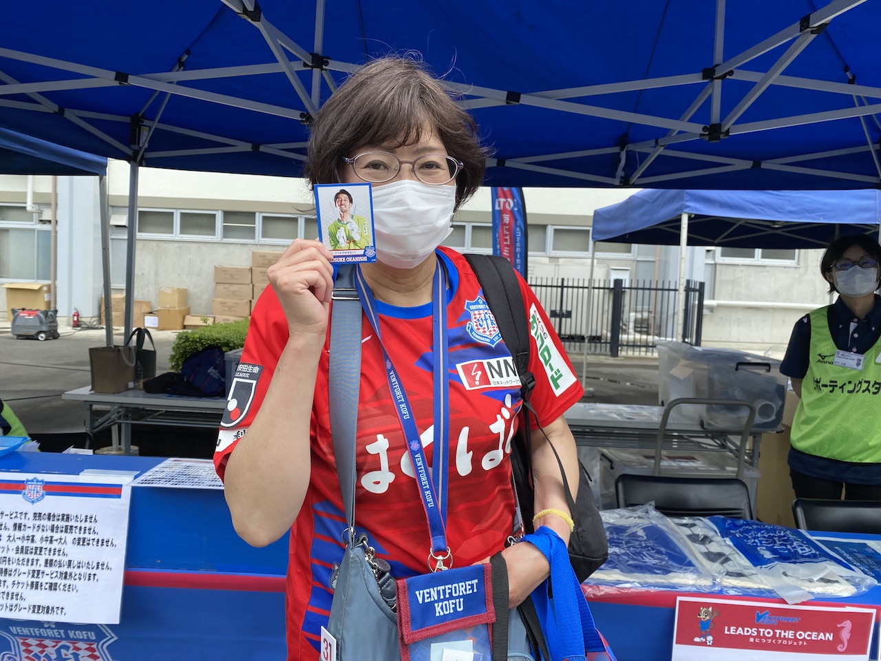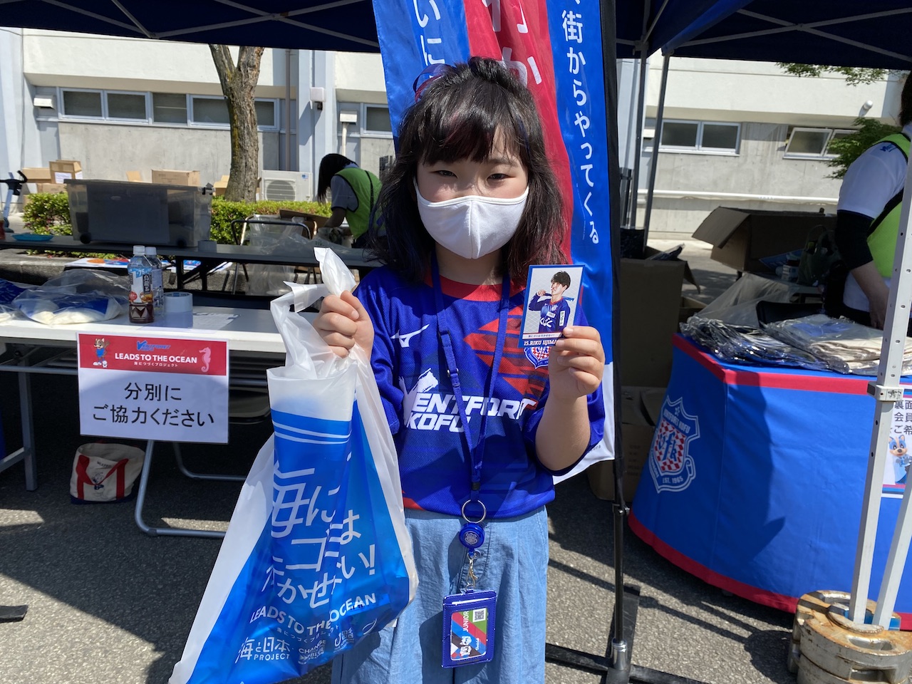 プレゼントのカードは岡西選手。岡西選手と同じカラーのユニフォームを着たちびっ子サポーターも参加!!山梨から海にゴミがいかないようにしっかり守ってくれました!